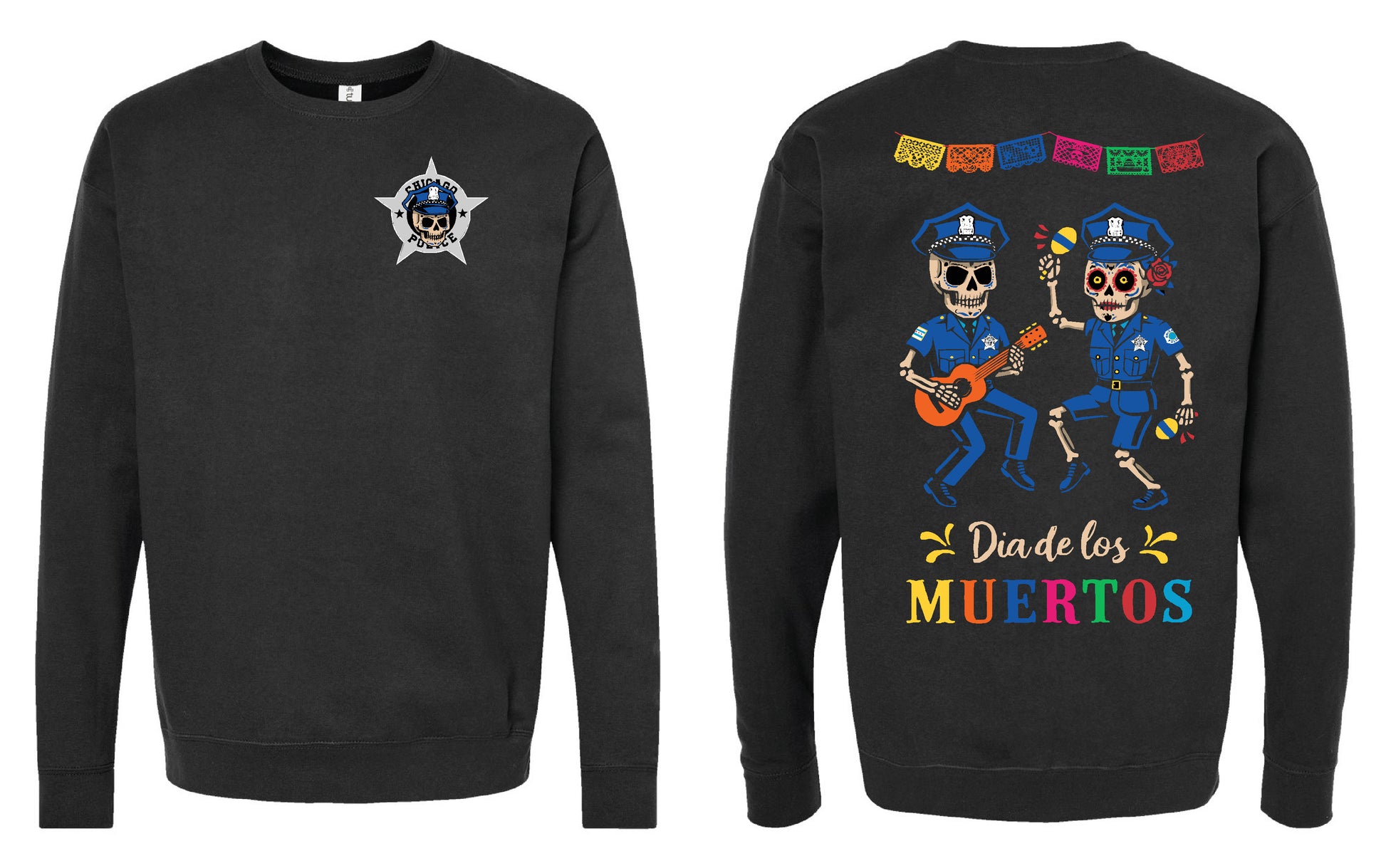 Featuring colorful skeleton officer artwork, papel picado, and bold lettering, this crewneck blends comfort with cultural pride.